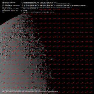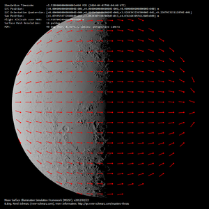 The MSISF maintains a database of so-called "surface patterns". Those surface patterns are slices of the Moon's surface, which have been preprocessed as 3D meshes (spatial points connected as triangles). Those patterns are currently available with spatial resolutions of 4, 16 and 64 pixels per degree (longitude/latitude), which refers to approximately 7.581, 1.895 and 0.474 km per pixel at the equator, respectively. The topography data is based on the Lunar Orbiter Laser Altimeter (LOLA) instrument data sets of the ongoing NASA Lunar Reconnaissance Orbiter (LRO) mission. Simply put, the MSISF selects the needed surface patterns accordingly to the visible surface for each picture, does the necessary (astro-)dynamical calculations (i.e. for the Sun, Moon and spacecraft positions), initiates the rendering of the scene and does some postprocessing with the final rendering. The rendering itself is done by POV-Ray, which is integrated in the MSISF.